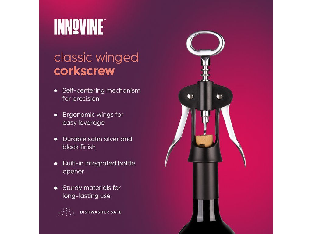 Krídlová vývrtka na víno Innovine je obľúbenou pomôckou na rýchle a pohodlné otvorenie fľaše vína. Je vybavená pokročilým samočinným centrovaním, ktoré zaisťuje perfektné umiestnenie špirály do korku pri každom použití.