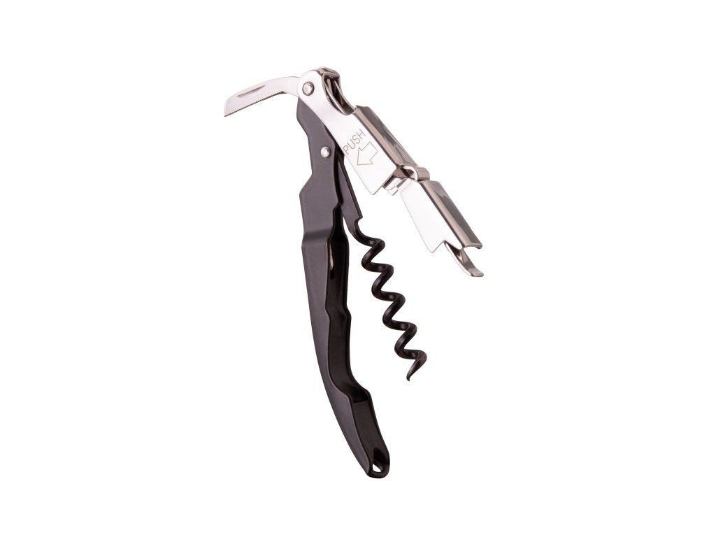 Waiter's Corkscrew Push kombinuje tři nástroje v jednom kompaktním designu: vývrtku na víno, odřezávač folie pro odstranění ochranného obalu z hrdla láhve a otevírač lahví pro pivo nebo limonády. Ušetříte tak místo a budete mít vše potřebné po ruce.