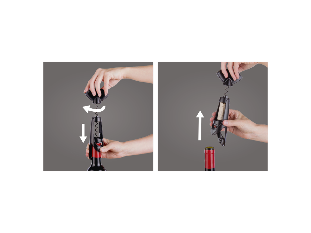 Otočná rukojeť: Jednoduchý otočný mechanismus pro snadné vyjmutí korku. -